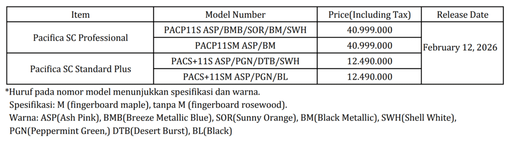 Yamaha Corporation resmi memperkenalkan dua model gitar elektrik terbaru dalam lini Pacifica, yakni “Pacifica SC Professional” dan “Pacifica SC Standard Plus”. Kedua model ini mulai tersedia pada 12 Februari 2026.